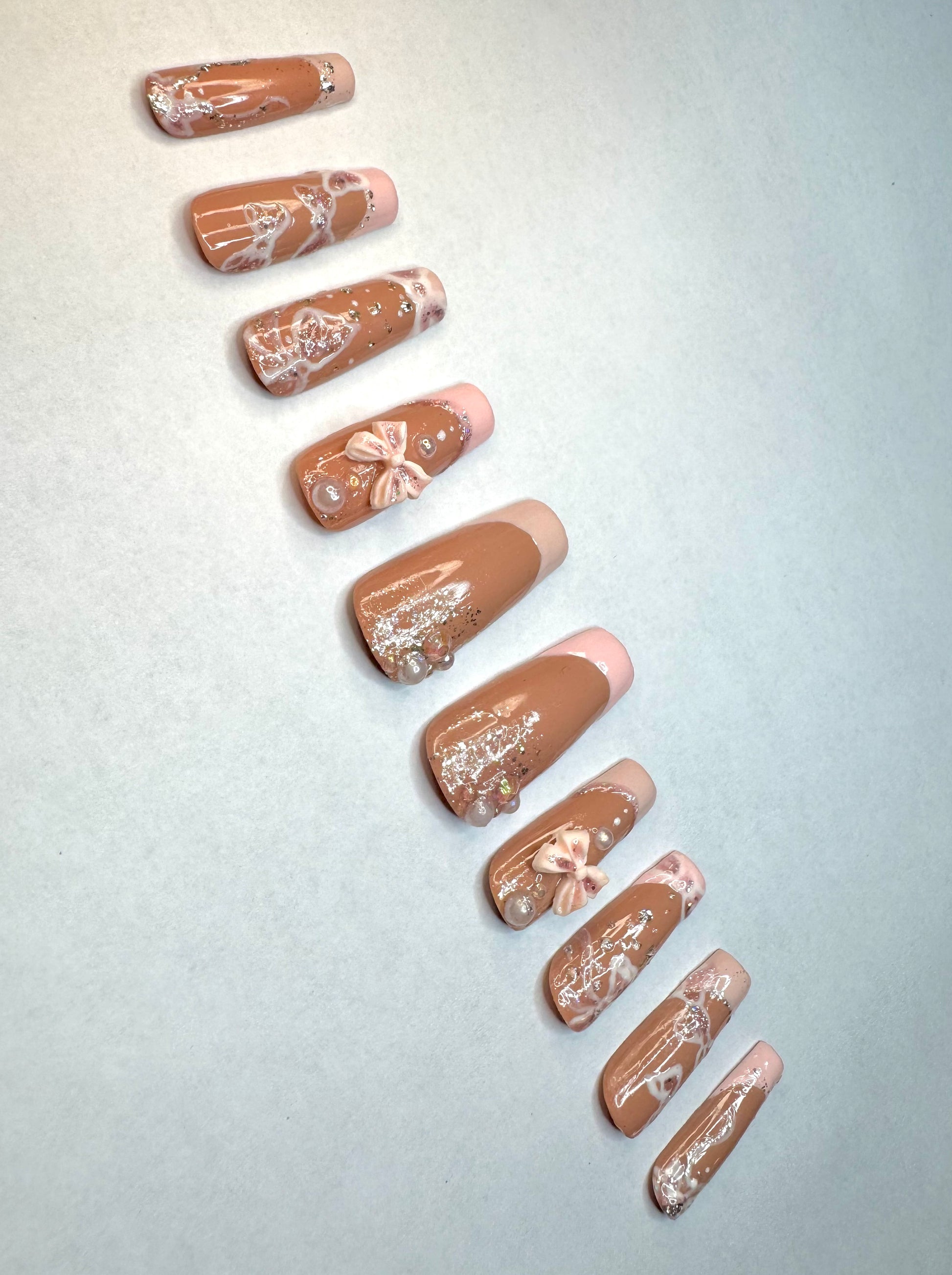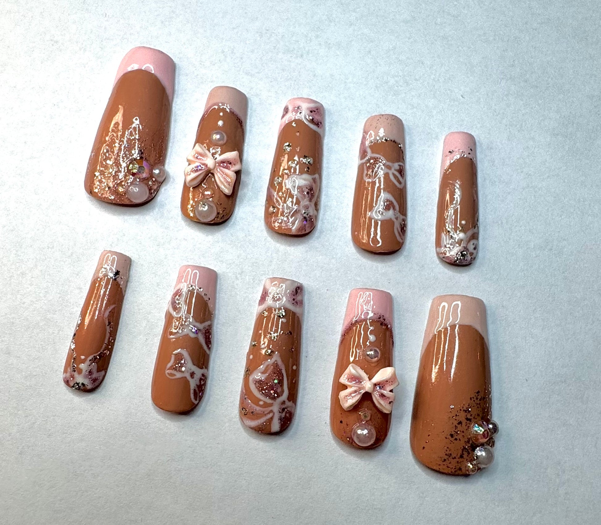 Alternated blush and baby pink french tips featuring pearls nestled between glitter and hand painted ribbons, as well as bow charms.