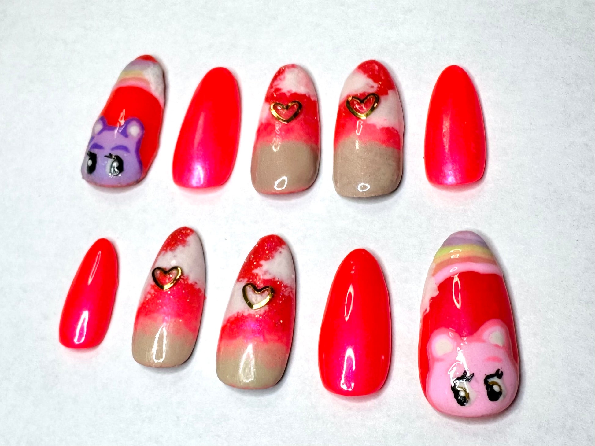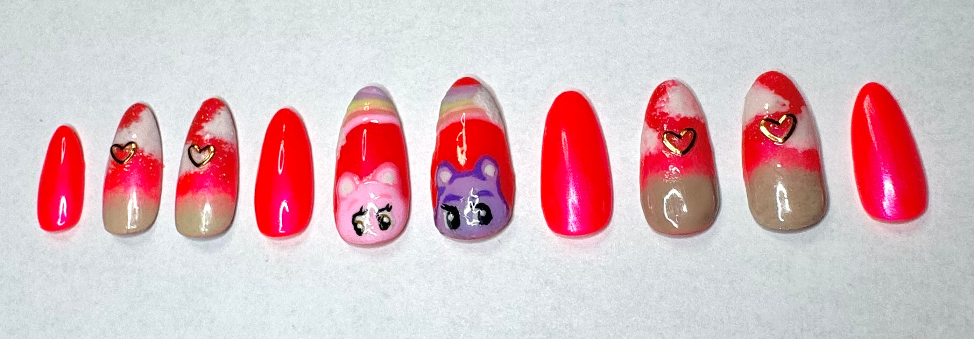 Care bears with pastel clouds and rainbows over neon pink with tinsel gold heart charms.