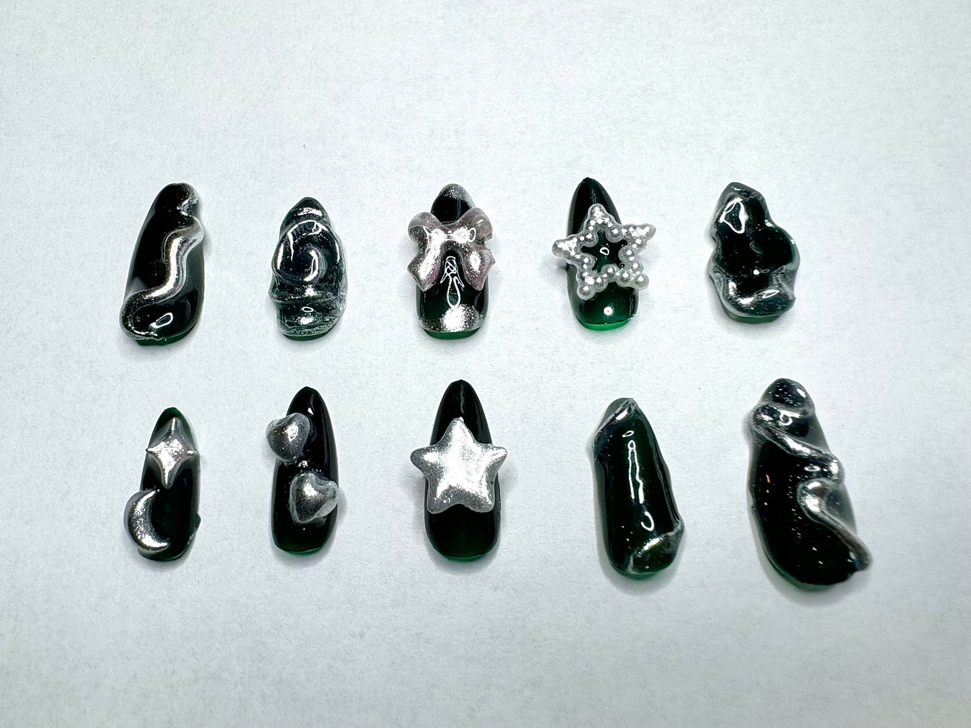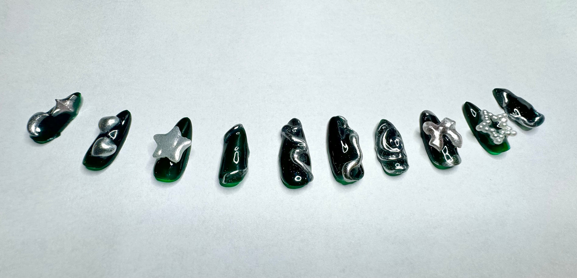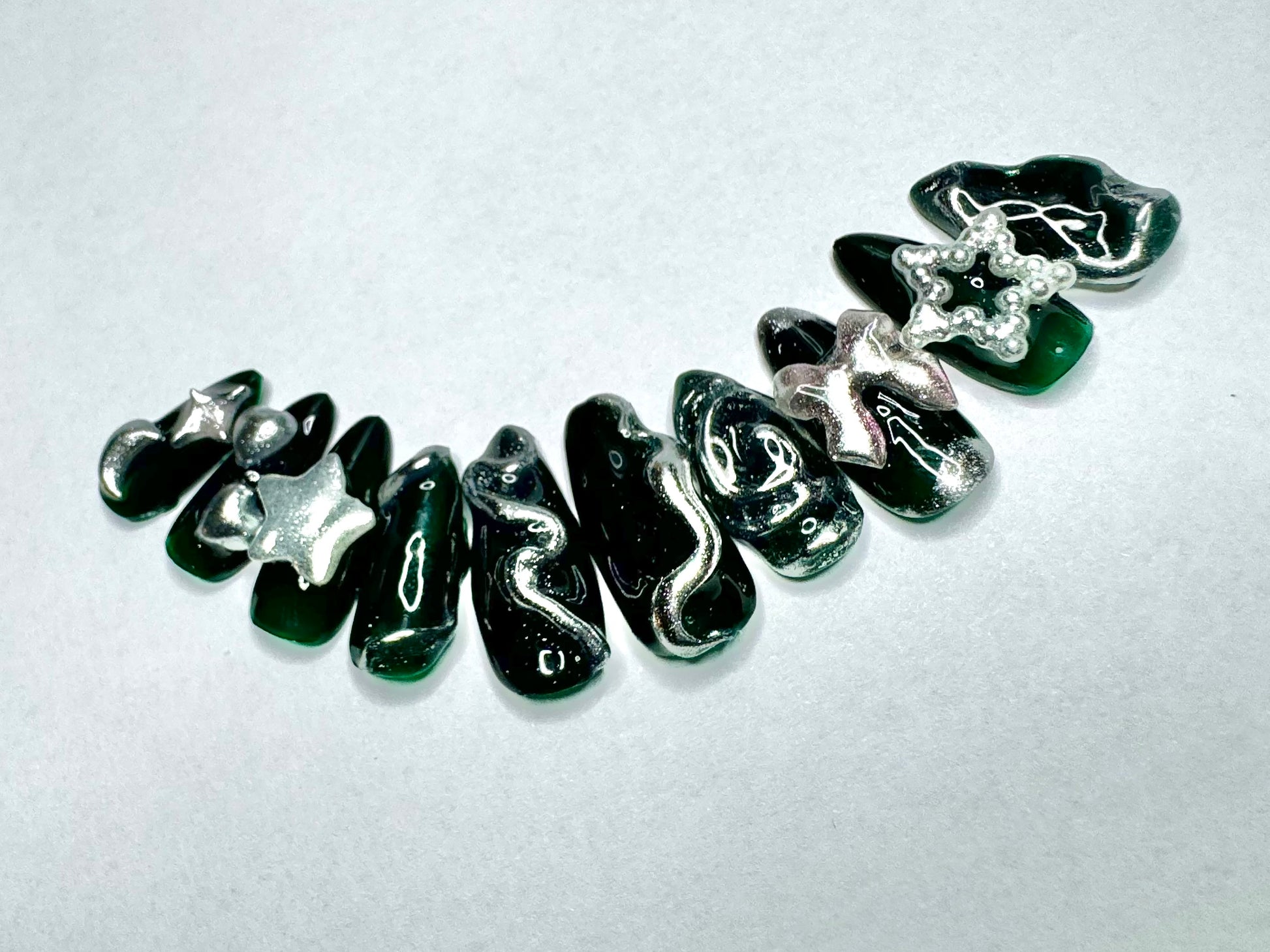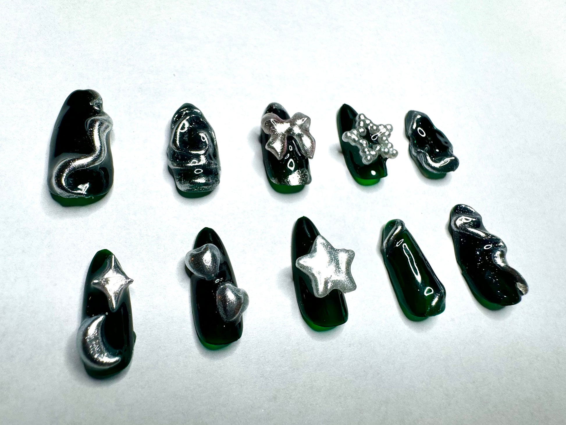 Jelly deep green background with silver chrome charms, and silver chrome 3D hand sculpted designs.