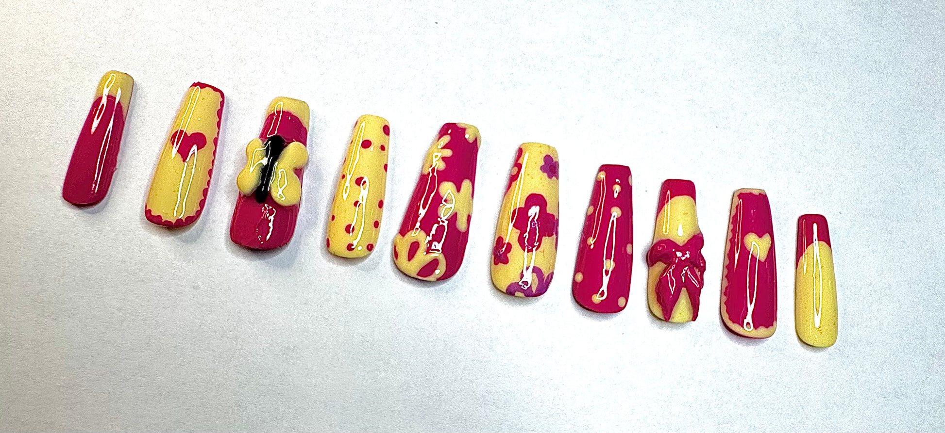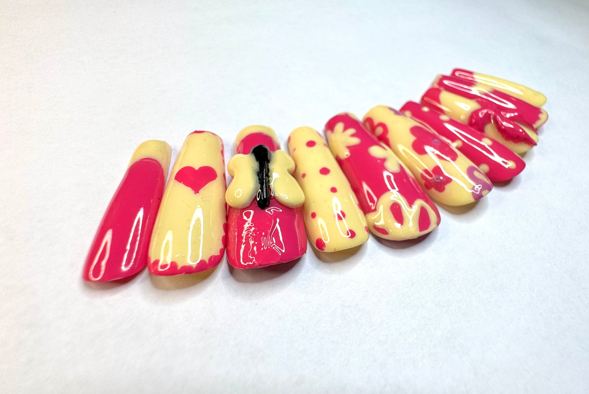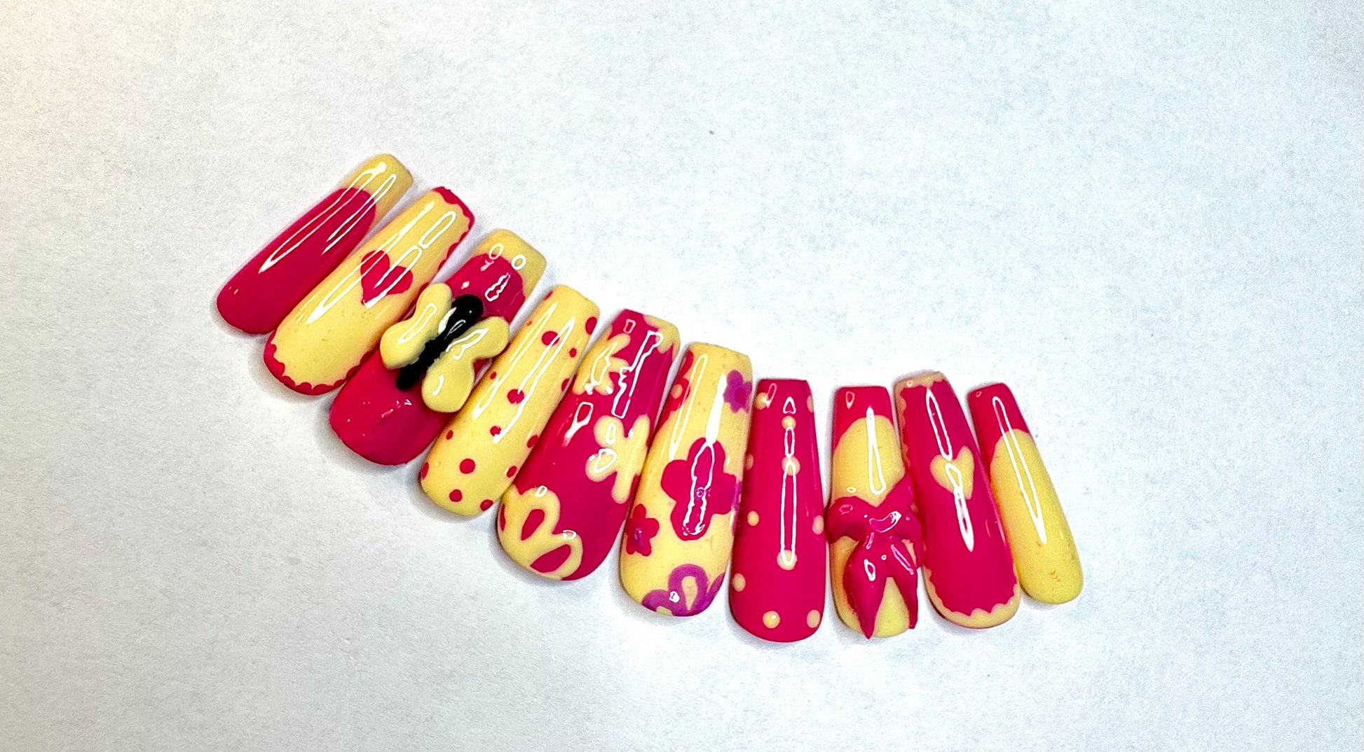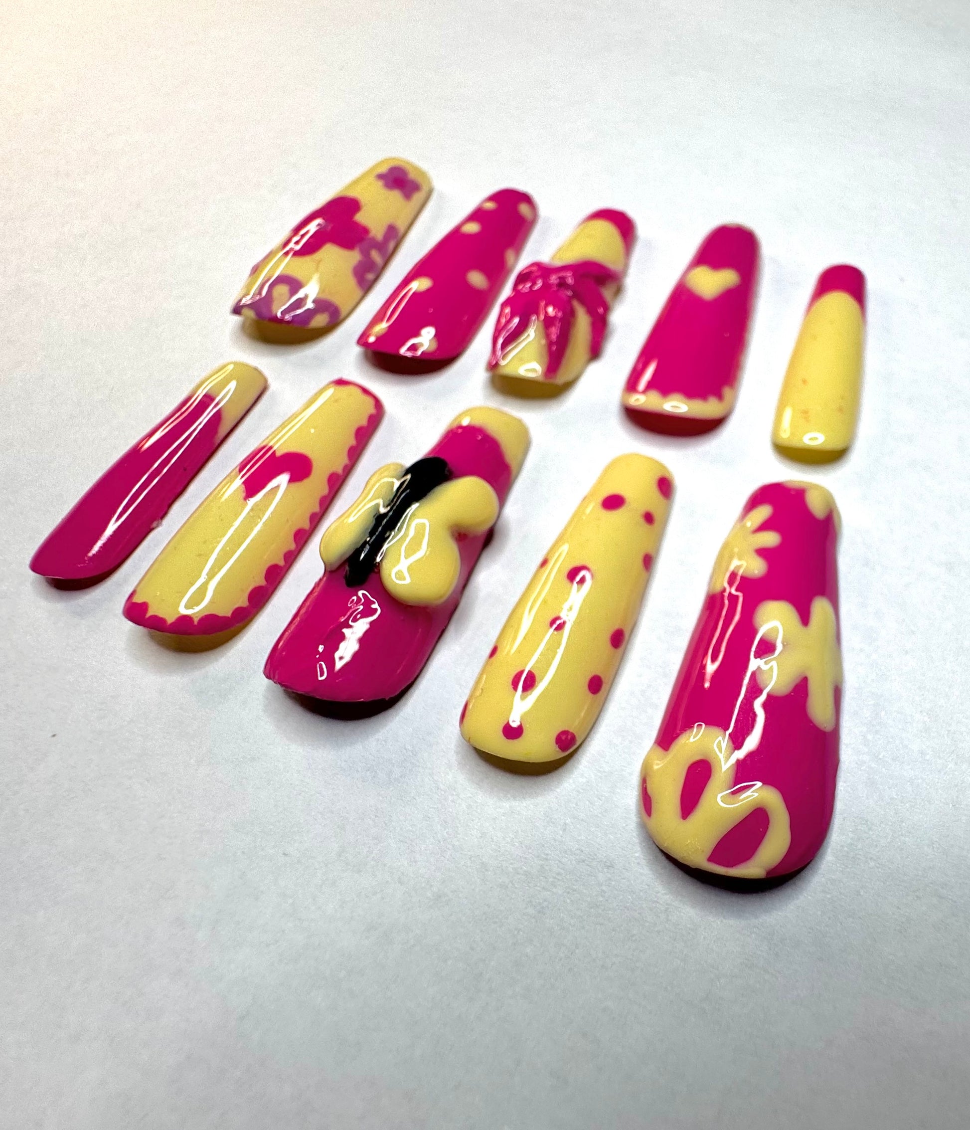 Spotted whimsical set featuring hand painted yellow and pink floral patterns with 3D butterfly.