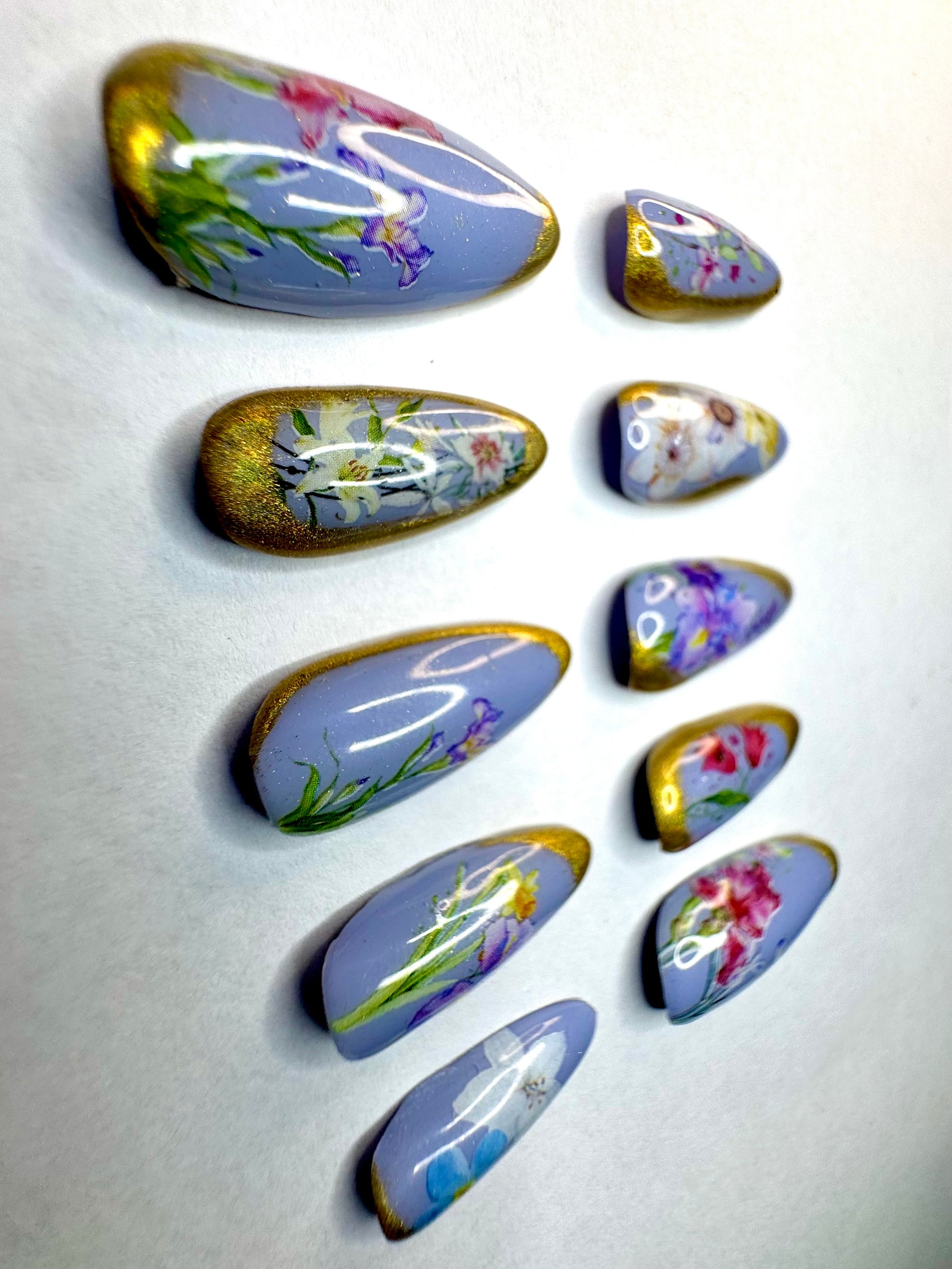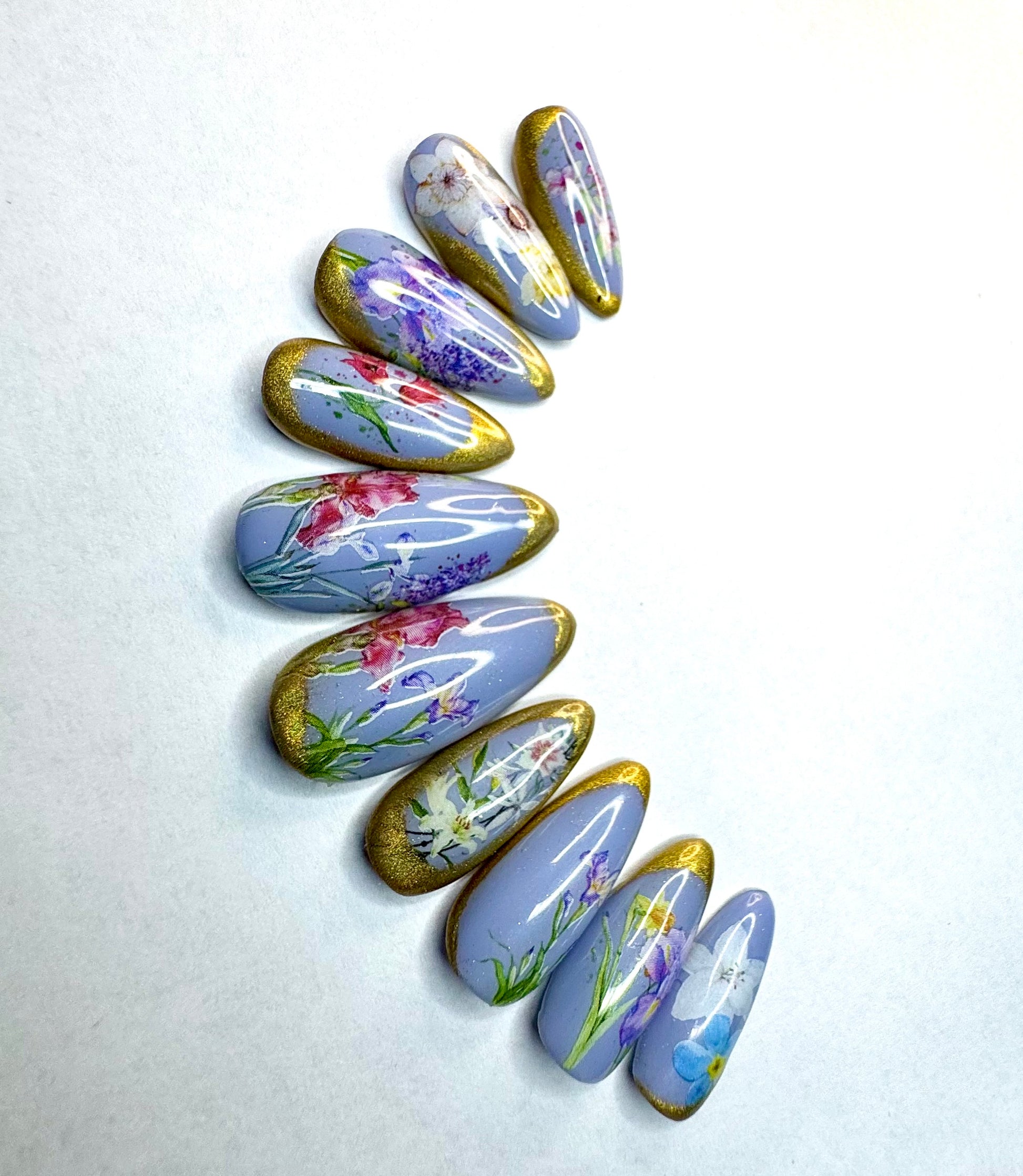 Gold chrome borders over blue lavender with spring floral decals overlayed.