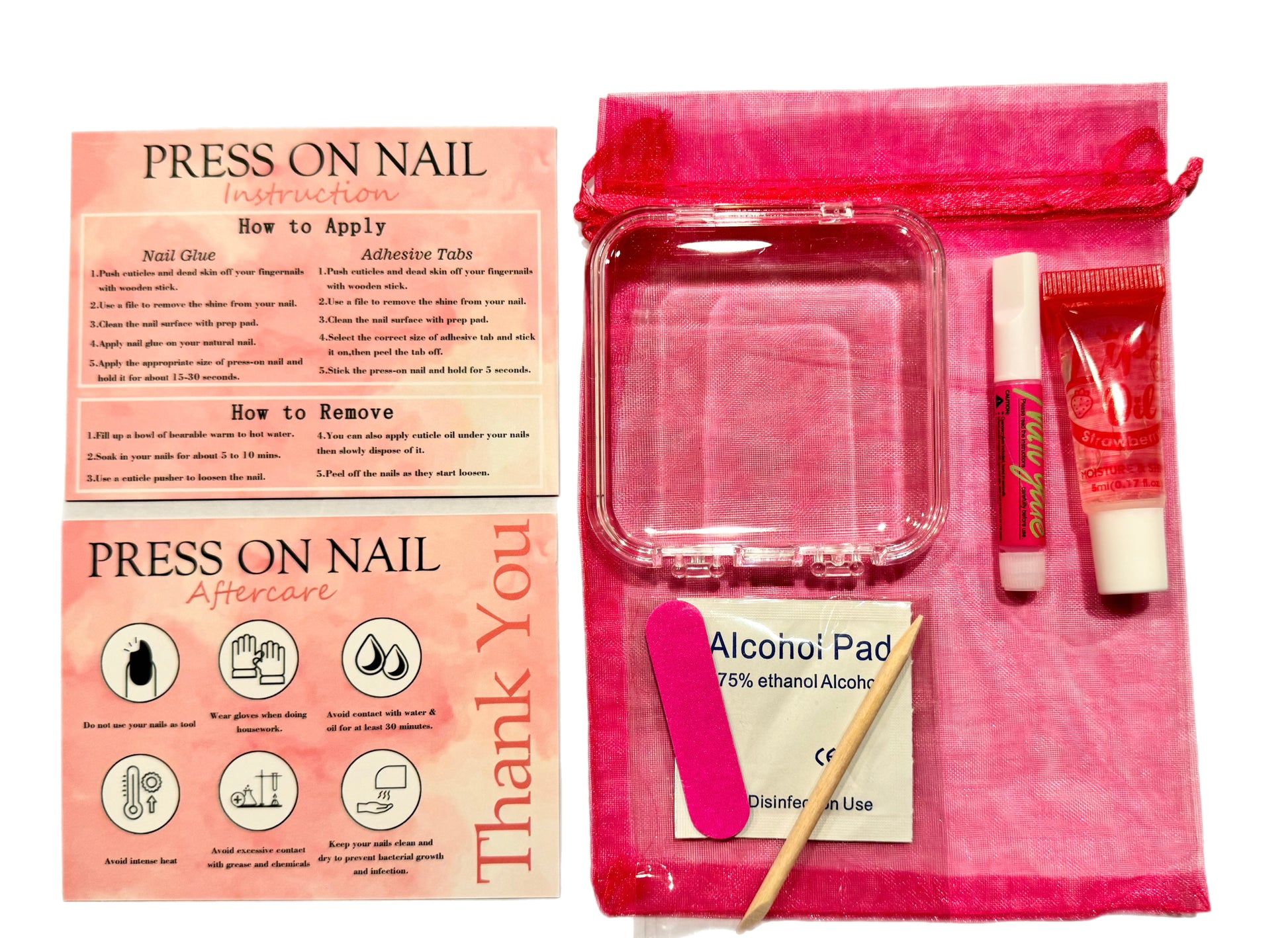 Included with each set: Double sided nail instruction/ aftercare card, Nail case, nail glue+mini prep kit with alcohol pad, Lip oil gloss mini.