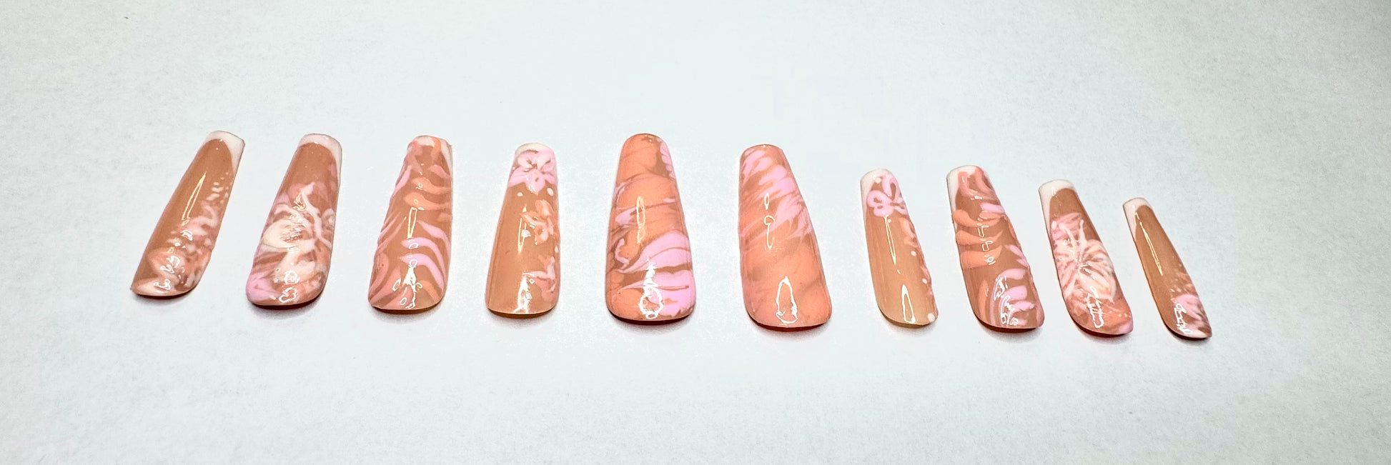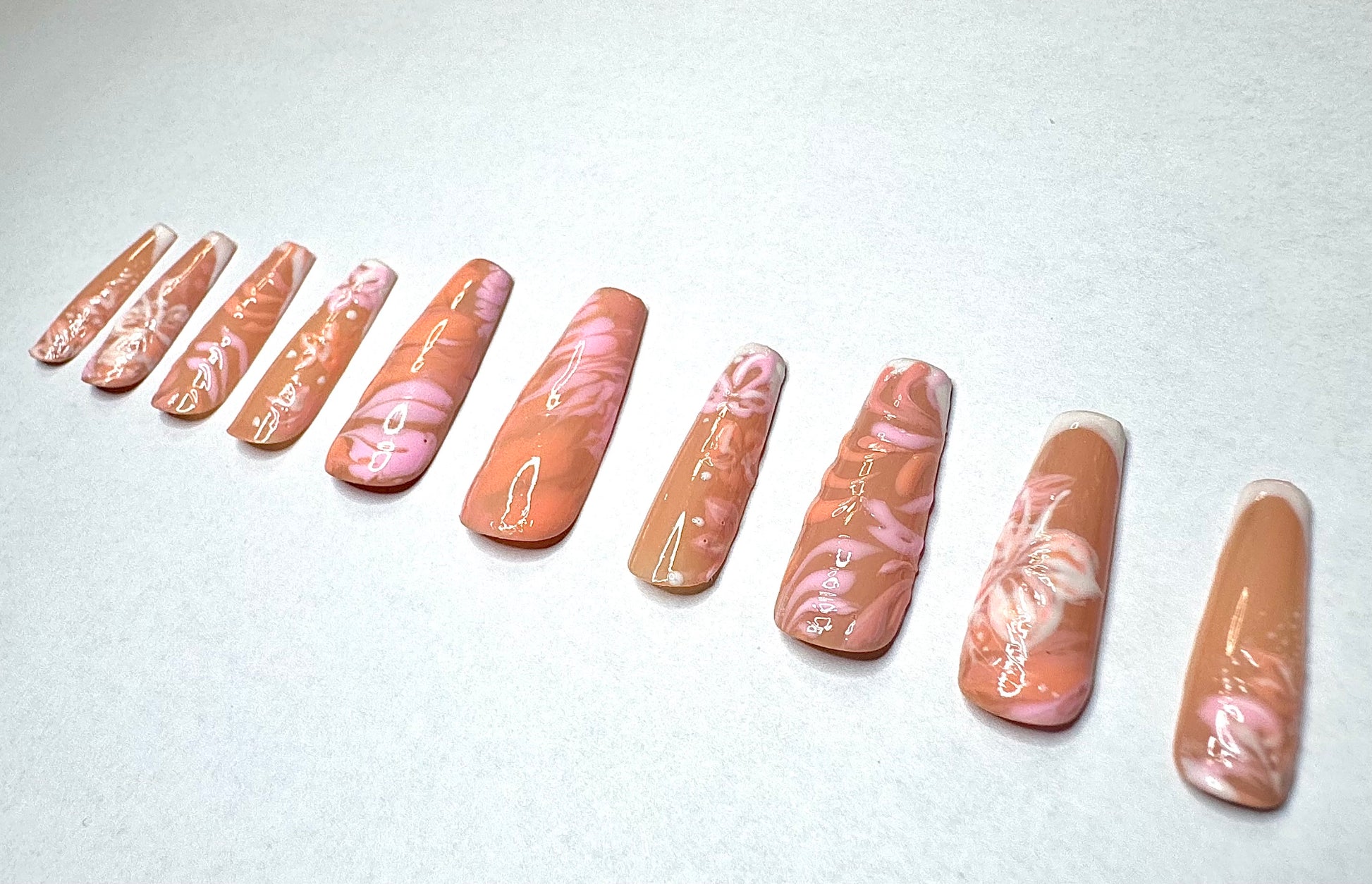 Swirls of orange and pink shades in tie-dye and hibiscus patterned over partial french tips.