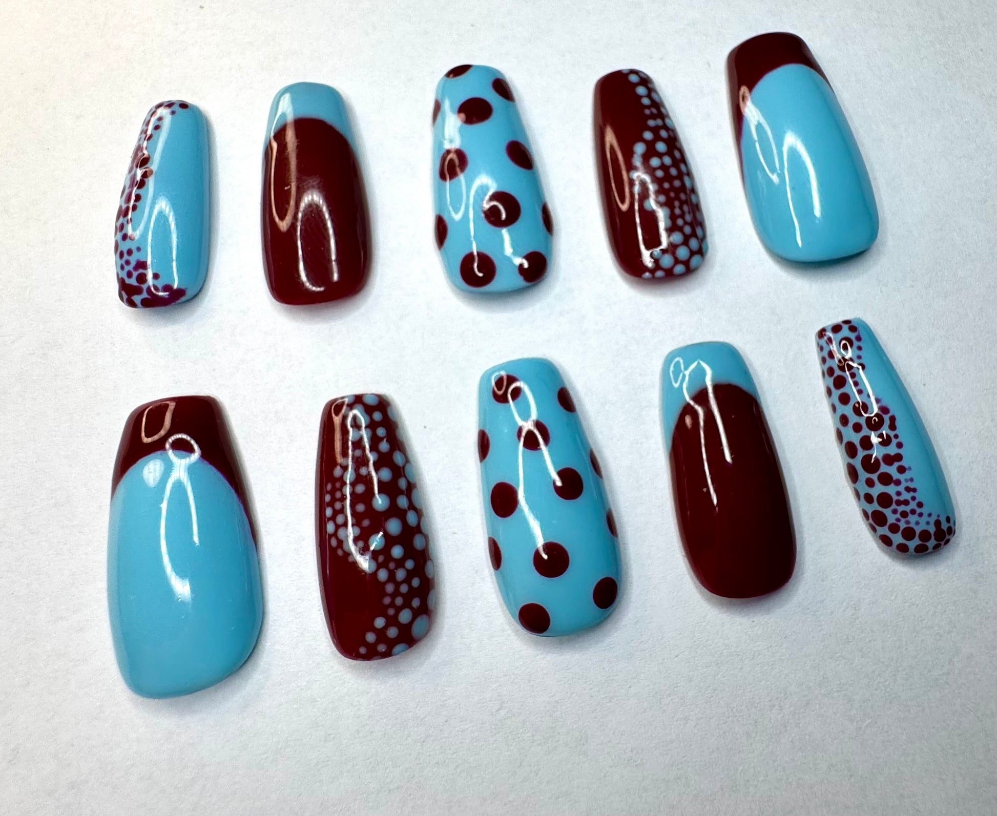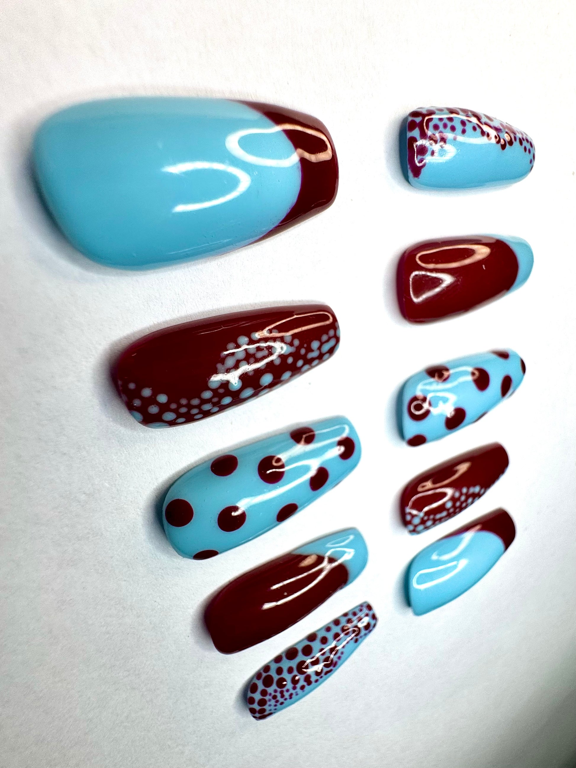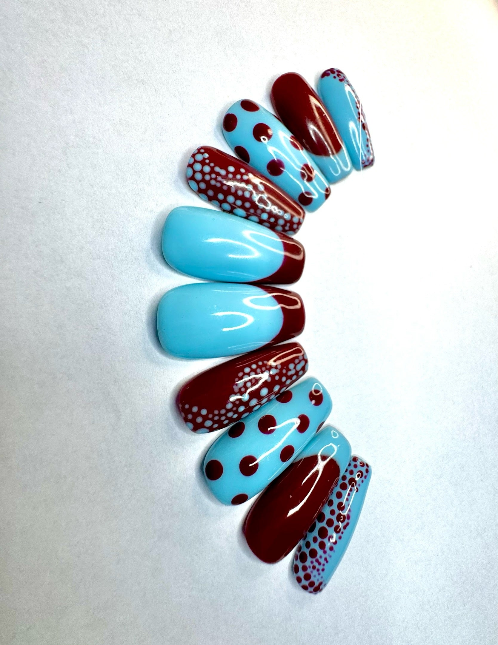 Inspired by Yayoi Kusama famous Japanese contemporary artist known for her use of dots in her work. Features burgundy and baby blue partial french tips with intricate stippling.