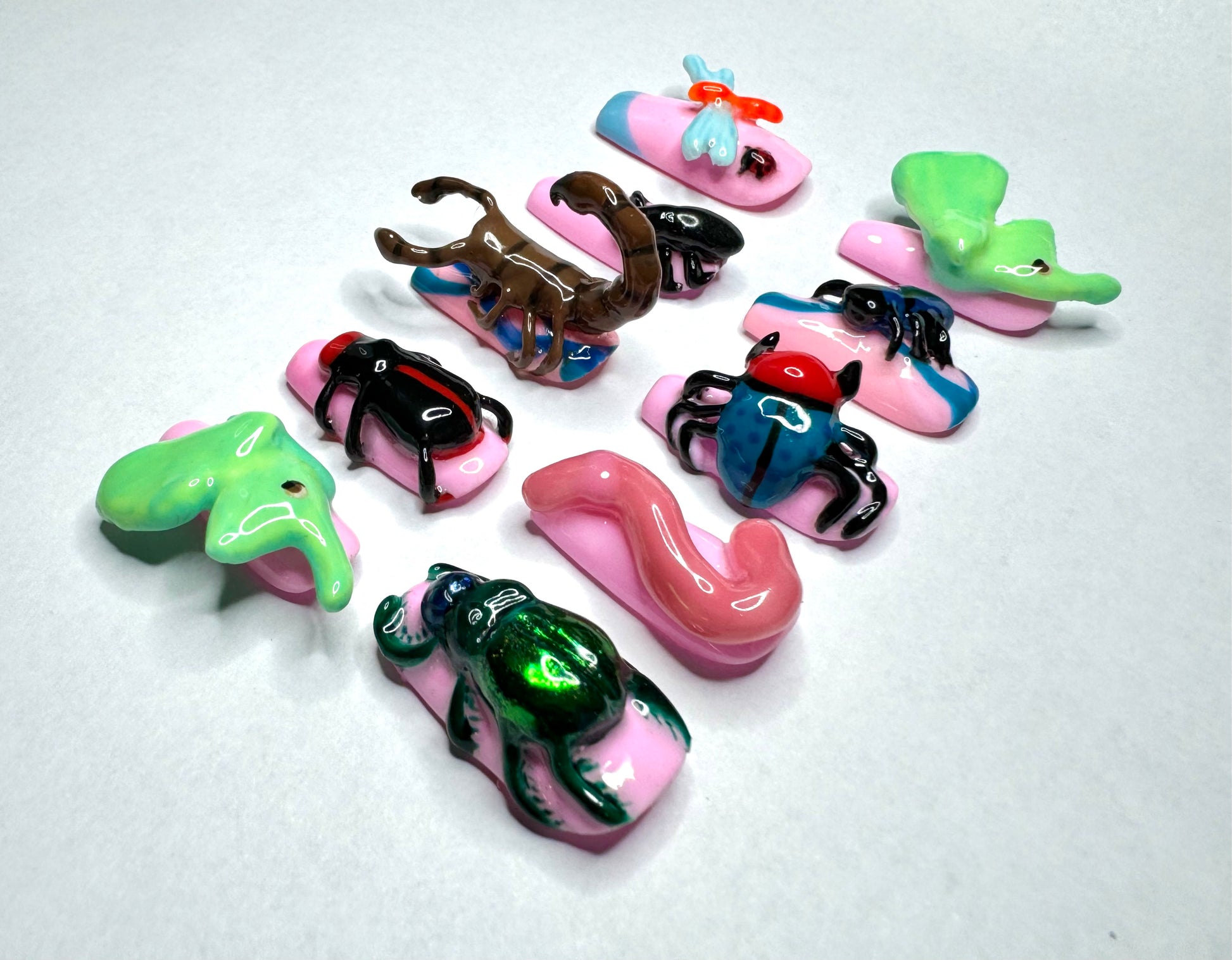 Lunar moth, Red beetle, scorpion, dragonfly, Green june beetle, earth worm, Flower beetle, Alder leaf beetle